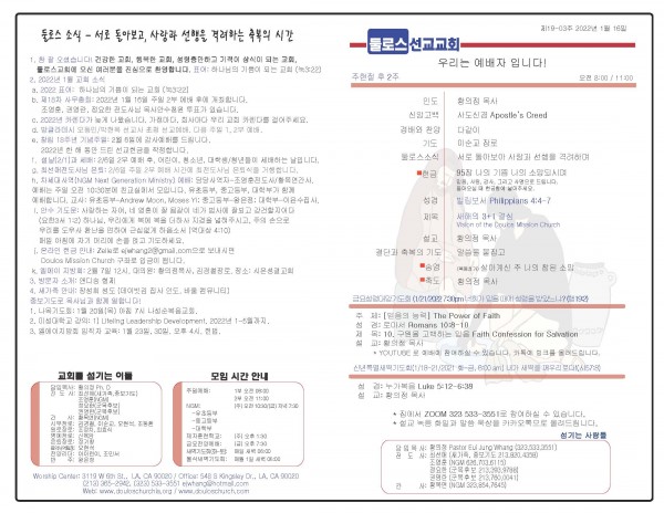 제목: 구원의 은혜에 감사하라! 본문: 로마서 10:9-15. 설교자: 황의정 목사 추수감사절에 감사를 묵상…